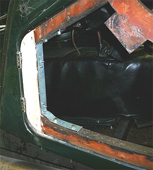 I finally decided to tackle the doors. After I removed the interior panels, I couldn't figure how to remove the door skin from the wooden frame. I finally decided to call John Sheally again and ask how the doors were built. He said "the wood door frame is assembled and a metal flange is nailed to it. Then the door skin is set on and the edges of the skin are crimped over the metal flange." He suggested not trying to disassemble the doors. I will have to sand the wood and the inside of the door. (I don't suggest using any paint stripper, and if it gets under the wood it would be difficult to neutralize.) After cleaning the inside of the door and the wood, I will apply epoxy to the wood and repaint the metal. The factory makes the door inner panels using 1/8" plywood which has disintegrated. I made the replacement panels from 1/4" plywood sealed with epoxy and will cover it with 1/4" foam rubber and naugahide.