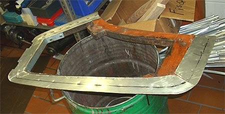 The last piece, to be made were the 2 curved pieces that support the sheet metal rear deck and fit on the outer edge of the fender arch just behind the cross brace. To get the curve, I used a curve tracing tool (made up of a lot of little rods held together by a cross brace). I placed this on the fender arch and tapped the top to get a nice fit. This curve was then traced on a small block of wood. The height of the cross brace was measured and transferred to the block of wood and the upper curve was sketched freehand. I used a band saw to cut the part out. Final shaping and smoothing was done using a drum sander chucked up in a drill press.